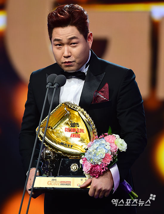 [엑스포츠뉴스=김한준 기자] 8일 오후 서울 양재동 The-K 호텔 컨벤션센터에서 열린 '2015 타이어뱅크 KBO 골든글러브 시상식'에서 포수 부문을 수상한 두산 양의지가 수상소감을 말하고 있다.