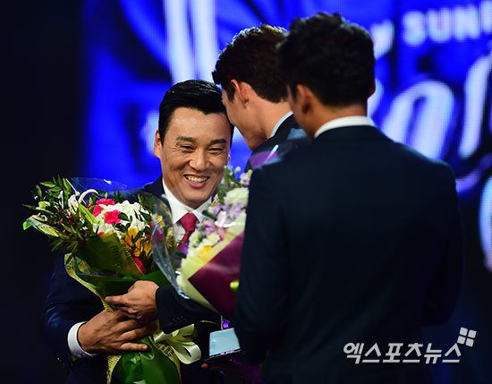 [엑스포츠뉴스=김한준 기자] 8일 오후 서울 양재동 The-K 호텔 컨벤션센터에서 열린 '2015 타이어뱅크 KBO 골든글러브 시상식'에서 지명타자 부문을 수상한 삼성 이승엽이 축하를 받고 있다.