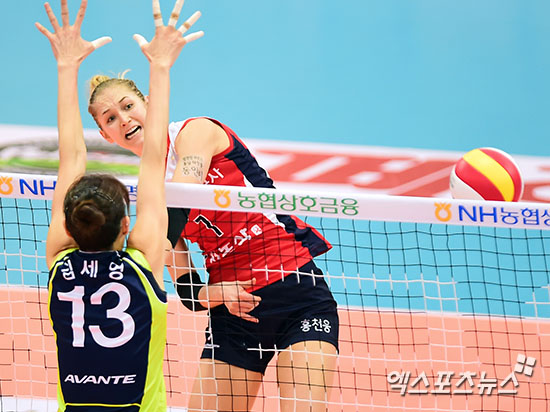 ​[엑스포츠뉴스=수원, 김한준 기자] 12일 오후 경기도 수원시 장안구 수원실내체육관에서 열린 'NH농협 2015-2016 V-리그' 현대건설 힐스테이트와 KGC 인삼공사의 경기, KGC 헤일리가 공격을 시도하고 있다.
