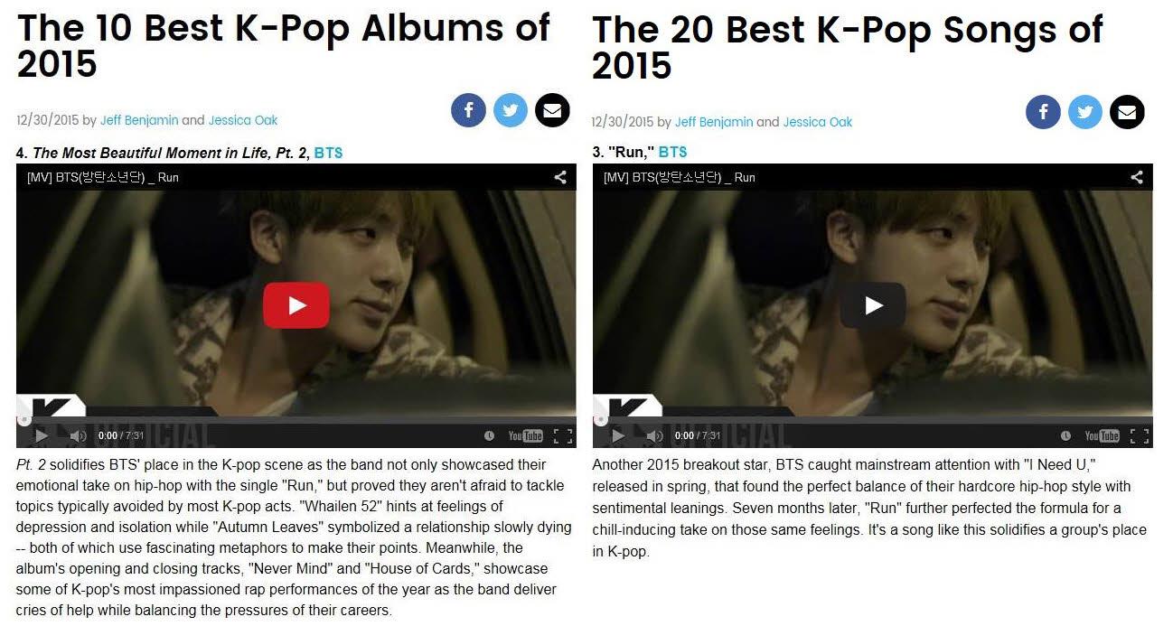 지난 12월 30일(이하 현지시각) 빌보드 지는 '2015 베스트 K-POP 앨범 10'과 '2015 베스트 K-POP 노래 20'을 발표했다. 빌보드 지는 방탄소년단의 앨범 '화양연화 pt.2'와 이 앨범의 타이틀곡 'RUN'을 각각 앨범 부문 4위와 노래 부문 3위로 선정했다.