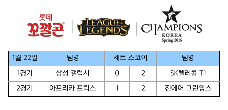 [엑스포츠뉴스=박상진 기자] 2016 롯데 꼬깔콘 리그 오브 레전드 스프링 순위(1월 22일)