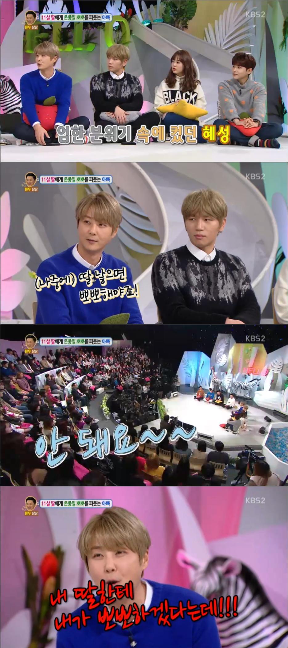 이날 사연을 읽은 후 신혜성에게 뽀뽀를 많이 했냐고 물어보자 "어릴 때 집이 엄한 편이었다"며 나중에 딸을 낳으면 뽀뽀를 하겠다고 했다. 이에 방청객은 "안돼요"라고 비명을 질렀다. 방청을 온 신혜성의 팬이었던 것.