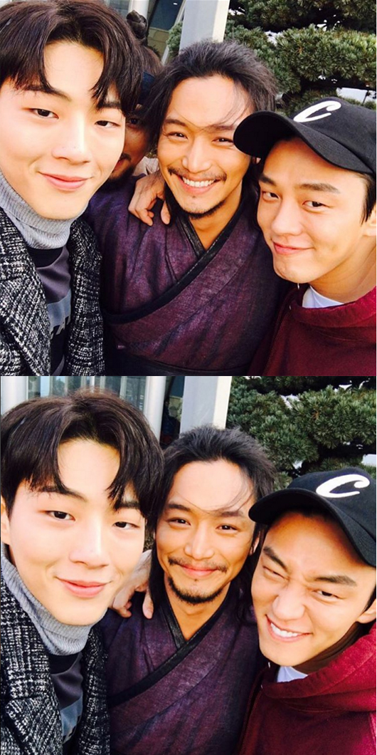 변요한은 4일 자신의 인스타그램에 '육룡이 나르샤' 촬영장에서 찍은 것으로 보이는 사진을 공개했다. 사진 속 변요한은 배우 지수, 유아인과 함께 환한 웃음을 보였다.