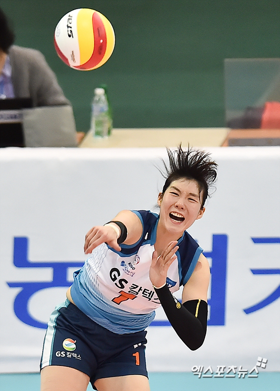 [엑스포츠뉴스=수원, 권혁재 기자] 10일 오후 경기도 수원시 수원실내체육관에서 열린 'NH농협 2015-2016 프로배구' 여자부 수원 현대건설과 서울 GS칼텍스 KIXX의 경기에서 GS 이소영이 강스파이크 서브를 시도하고 있다.