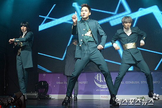 [엑스포츠뉴스=박지영 기자] 18일 오후 서울시 마포구 서교동 YES24 무브홀에서 열린 뉴이스트 4번째 미니앨범 'Q is'의 쇼케이스에 참석한 뉴이스트 JR, 아론, 백호, 민현, 렌이 멋진 무대를 선보이고 있다.