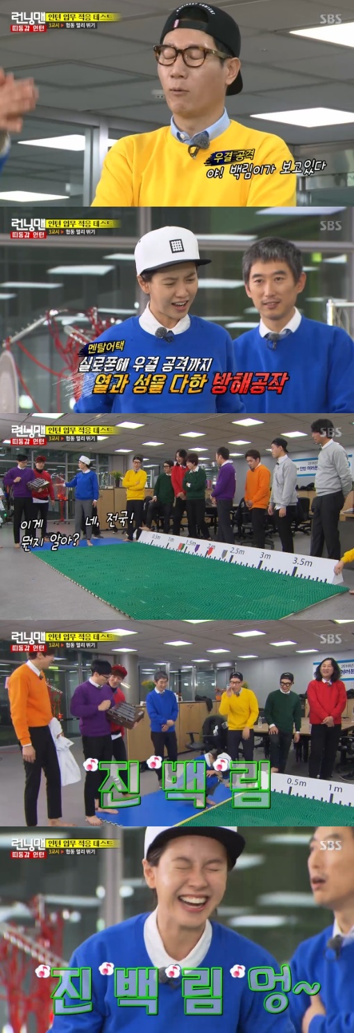 이날 인턴 업무 적응 테스트 3교시는 지압판에서 협동 멀리뛰기 게임을 했다. 송지효의 차례가 되자 지석진은 준비하는 송지효에게 "백림 씨가 보고 있다"라며 송지효와 중국판 '우리 결혼했어요' 촬영 중인 진백림을 언급하며 송지효를 방해했다.