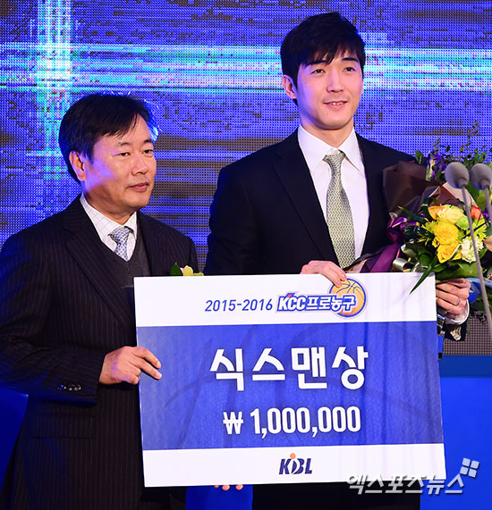 [엑스포츠뉴스=김한준 기자] 22일 오후 서울 반포동 JW메리어트 호텔 서울에서 열린 '2015-2016 KCC 프로농구' 시상식에서 식스맨상을 수상한 전주 KCC 신명호가 기념촬영을 갖고 있다.