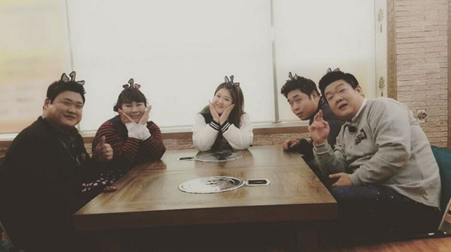 이국주는 25일 자신의 인스타그램에 "왜 모였을까요^~^ #추운데여긴덥다 #꽉찬다 #배고프다 #가족같다 #이국주 #김민경 #문세윤 #유민상 #김준현 #밥주세요"라는 글과 함께 한 장의 사진을 게재했다.