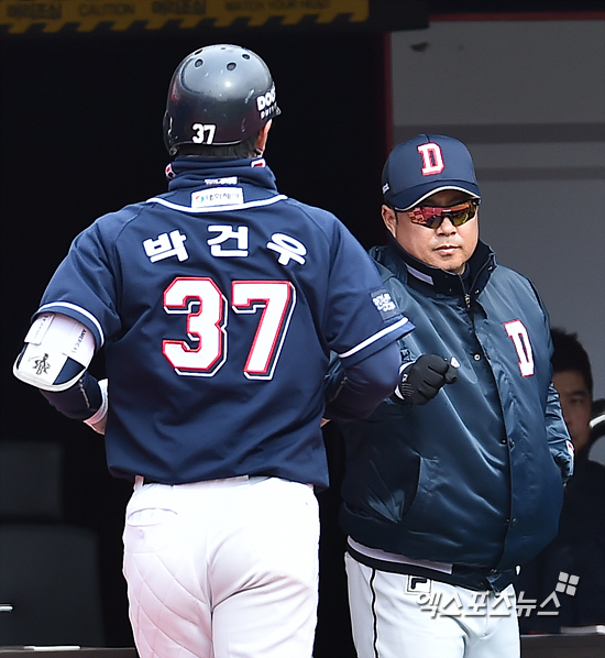 [엑스포츠뉴스=수원, 권혁재 기자] 8일 오후 경기도 수원시 장안구 수원kt위즈파크에서 열린 '2016 KBO 리그 시범경기' 두산 베어스와 kt 위즈의 경기, 두산이 0-5으로 뒤진 5회초 두산 김태형 감독이 솔로 홈런을 친 두산 박건우와 하이파이브 하고 있다.