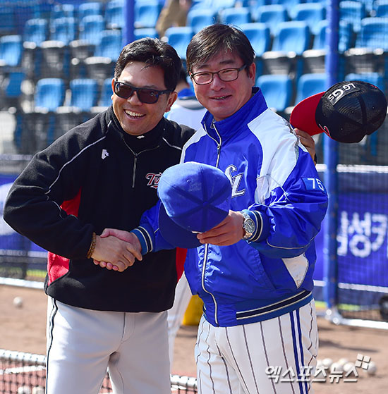 [엑스포츠뉴스=대구, 김한준 기자] 22일 오후 대구삼성라이온즈파크에서 열리는 '2016 타이어뱅크 KBO 리그' LG 트윈스와 삼성 라이온즈의 시범경기에 앞서 LG 양상문 감독과 삼성 류중일 감독이 인사를 나누고 있다.