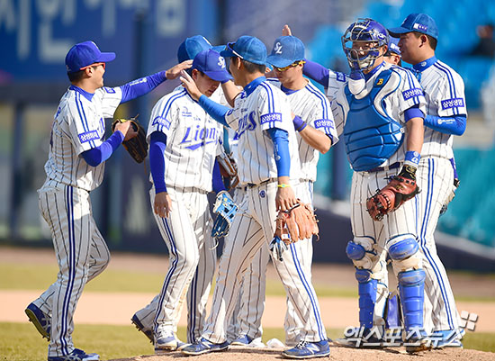 이날 경기에서 승리한 삼성 선수들이 하이파이브를 하고 있다.