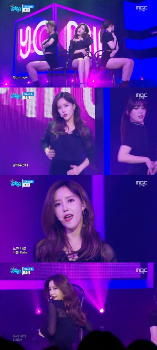 26일 방송된 MBC '쇼! 음악중심'에서는 효민이 '스케치' 무대를 꾸몄다. 블랙 의상을 입고 등장한 효민은 섹시한 안무와 퍼포먼스로 눈을 사로잡았다. 특히 대체로 어두운 무대 속에서 강렬한 효민의 레드립이 더 매혹적인 분위기를 연출했다.