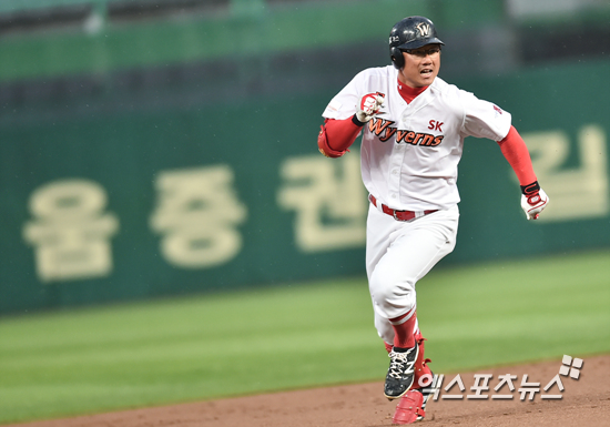 [엑스포츠뉴스=권혁재 기자] 20일 오후 인천광역시 남구 인천SK행복드림구장에서 열린 '2016 타이어뱅크 KBO리그' 넥센 히어로즈와 SK 와이번스의 경기, SK가 1:0으로 앞선 1회말 2아웃 1루 SK 박정권이 우전안타를 친 후 공이 홈으로 송구되는 사이 3루를 향해 쇄도하고 있다.