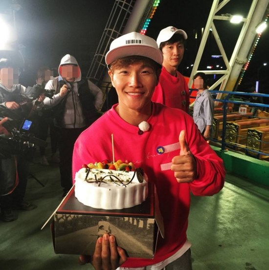 공개된 사진에서 김종국은 케이크를 받고 환하게 미소를 띄웠다. 뒤에 선 이광수의 표정이 인상적. 김종국은 1976년 4월 25일생으로 이날 만 40세 생일을 맞이했다.