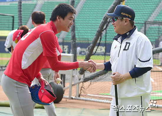 [엑스포츠뉴스=김한준 기자] 26일 오후 서울 송파구 잠실야구장에서 열리는 SK 와이번스와 두산 베어스의 경기, 두산 김태형 감독이 지난 24일 통산 100승을 달성한 SK 김광현을 축하하고 있다.