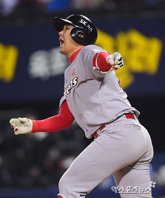 [엑스포츠뉴스=김한준 기자] 26일 오후 서울 송파구 잠실야구장에서 열린 SK 와이번스와 두산 베어스의 경기, 5회초 SK 최정이 헛스윙 삼진을 당하면서 배트를 놓치고 있다.