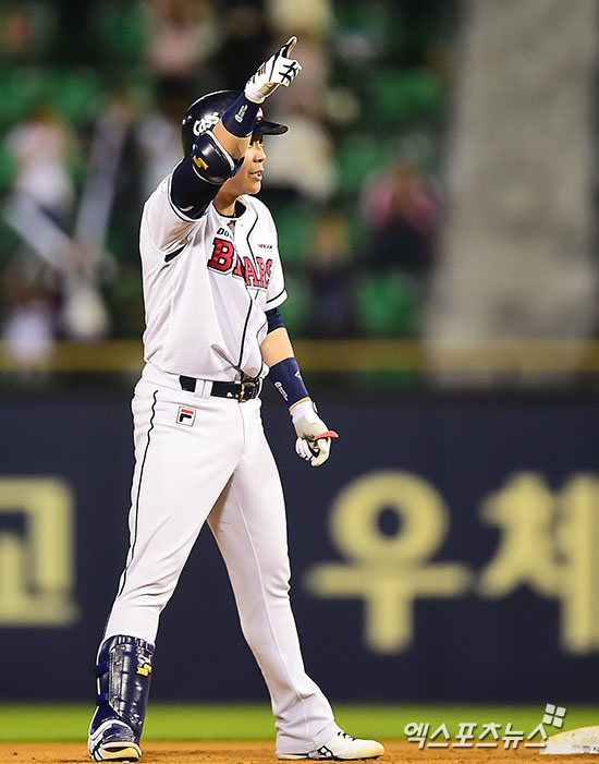 [엑스포츠뉴스=김한준 기자] 26일 오후 서울 송파구 잠실야구장에서 열린 SK 와이번스와 두산 베어스의 경기, 6회말 무사 만루 두산 박세혁이 2타점 2루타를 날린 후 세리머니를 하고 있다.
