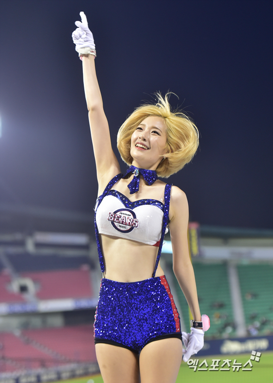 [엑스포츠뉴스=권혁재 기자] 28일 오후 서울 송파구 잠실야구장에서 열린 '2016 타이어뱅크 KBO리그' SK 와이번스와 두산 베어스의 경기, 두산 치어리더가 화려한 안무를 선보이고 있다.