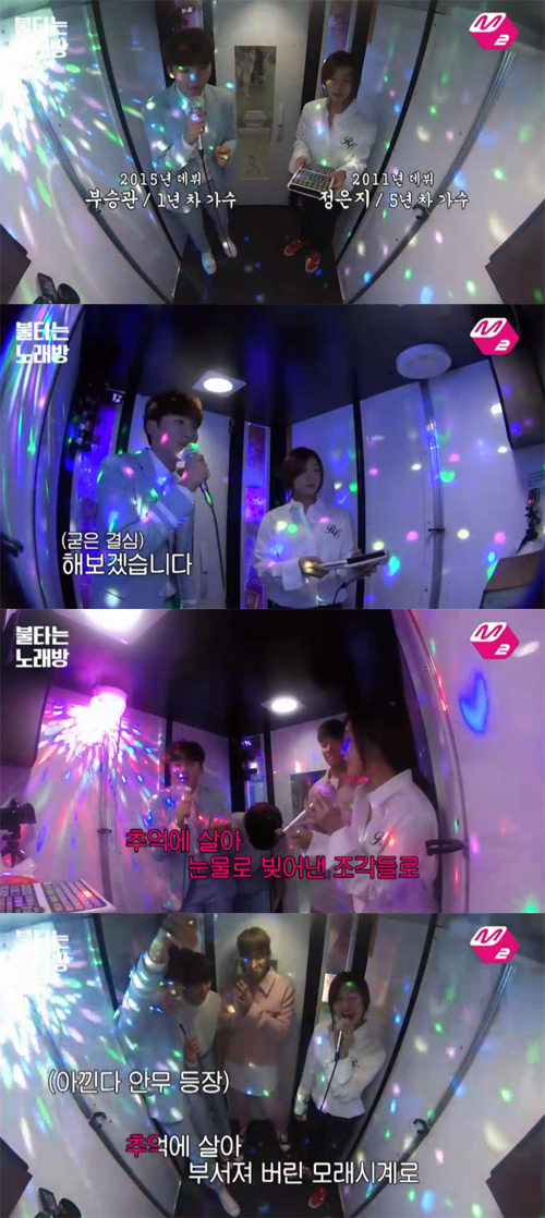 '불타는 노래방'은 Mnet의 디지털 콘텐츠 브랜드 엠투(M2)에 편성된 프로그램으로, 부스식 동전노래방에서의 아이돌의 모습을 여과 없이 보여주는 포맷. 지난 12일 공개된 '불타는 노래방'에서는 정은지와 세븐틴 멤버들이 출연했다.