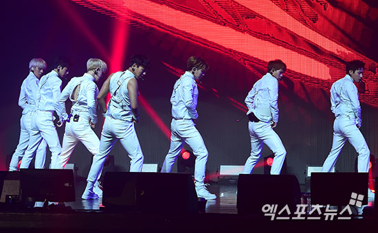 [엑스포츠뉴스=김한준 기자] 18일 오후 서울 광장동 예스24라이브홀에서 열린 힙합 보이그룹 몬스타엑스 세 번째 미니앨범 'THE CLAN PART.1 LOST'의 쇼케이스에 참석한 몬스타엑스가 멋진 공연을 선보이고 있다.