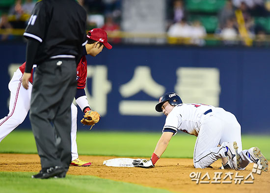 [엑스포츠뉴스=김한준 기자] 18일 오후 서울 송파구 잠실야구장에서 열린 '2016 타이어뱅크 KBO리그' KIA 타이거즈와 두산 베어스의 경기, 4회말 무사 1루 두산 김재호 타석 때 나온 폭투 상황에서 1루 주자 허경민이 2루까지 진루하고 있다.