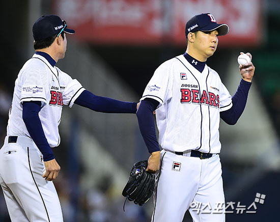 [엑스포츠뉴스=김한준 기자] 18일 오후 서울 송파구 잠실야구장에서 열린 '2016 타이어뱅크 KBO리그' KIA 타이거즈와 두산 베어스의 경기, 6회초 2사 1,2루 두산 선발투수 장원준이 강판당하고 있다.