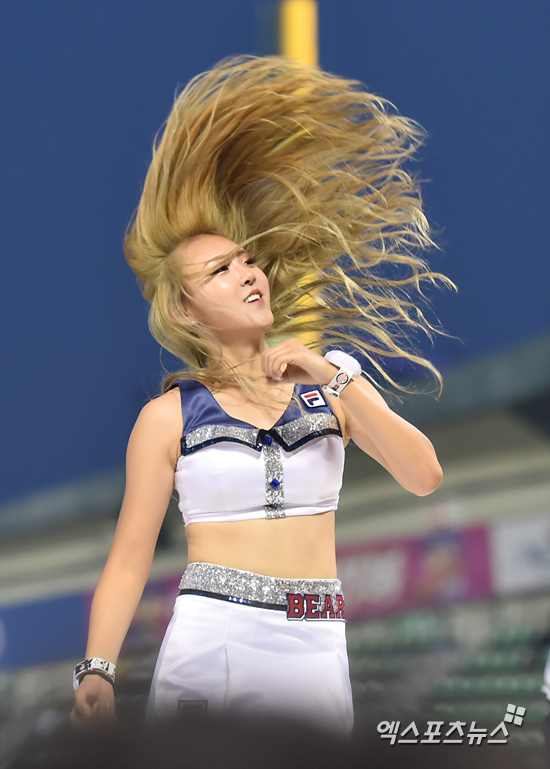 [엑스포츠뉴스=권혁재 기자] 25일 오후 서울 송파구 잠실야구장에서 열린 '2016 타이어뱅크 KBO리그' kt 위즈와 두산 베어스의 경기에서 두산 치어리더가 화려한 안무를 선보이고 있다.