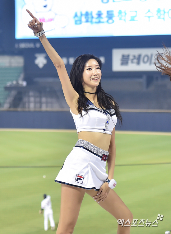 [엑스포츠뉴스=권혁재 기자] 25일 오후 서울 송파구 잠실야구장에서 열린 '2016 타이어뱅크 KBO리그' kt 위즈와 두산 베어스의 경기에서 두산 치어리더가 화려한 안무를 선보이고 있다.