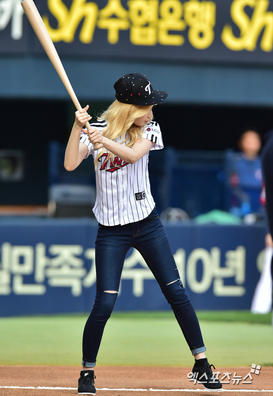 [엑스포츠뉴스=권혁재 기자] 31일 오후 서울 송파구 잠실야구장에서 열린 '2016 타이어뱅크 KBO리그' KIA 타이거즈와 LG 트윈스의 경기에 앞서 시타를 맡은 걸그룹 트와이스 사나가 타격 자세를 취하고 있다.