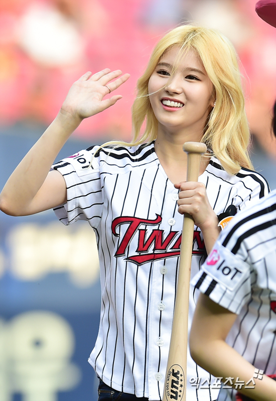 [엑스포츠뉴스=권혁재 기자] 31일 오후 서울 송파구 잠실야구장에서 열린 '2016 타이어뱅크 KBO리그' KIA 타이거즈와 LG 트윈스의 경기에 앞서 시타를 마친 트와이스 멤버 사나가 손을 흔들며 그라운드를 빠져나가고 있다.