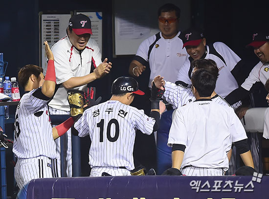 [엑스포츠뉴스=김한준 기자] 31일 오후 서울 송파구 잠실야구장에서 열린 '2016 타이어뱅크 KBO리그' KIA 타이거즈와 LG 트윈스의 경기, 4회말 2사 3루 LG 정주현이 정성훈의 1타점 2루타때 득점에 성공한 후 더그아웃에서 하이파이브를 하고 있다.