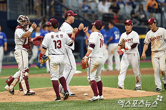 경기 종료 후 넥센 히어로즈 선수들이 마운드에서 하이파이브를 나누고 있다.