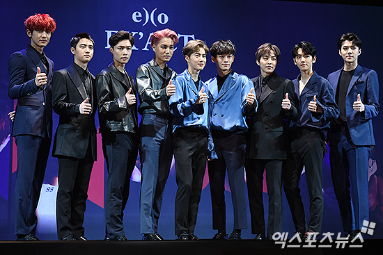 [엑스포츠뉴스=박지영 기자] 8일 오전 서울 삼성동 코엑스 SM아티움에서 열린 EXO 정규 3집 앨범 'EX'ACT(이그잭트)' 컴백 기자회견에 참석한 엑소가 포토타임을 갖고 있다.