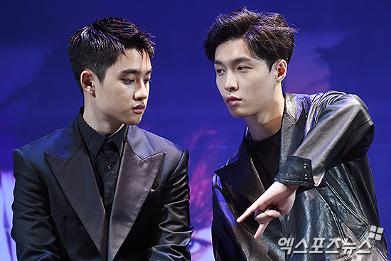 [엑스포츠뉴스=박지영 기자] 8일 오전 서울 삼성동 코엑스 SM아티움에서 열린 EXO 정규 3집 앨범 'EX'ACT(이그잭트)' 컴백 기자회견에 참석한 엑소 디오와 레이가 이야기를 하고 있다.