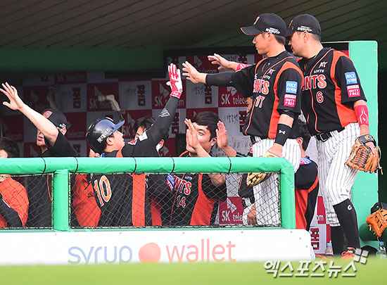 [엑스포츠뉴스=인천, 김한준 기자] 8일 오후 인천SK행복드림구장에서 열린 '2016 타이어뱅크 KBO리그' 롯데 자이언츠와 SK 와이번스의 경기, 1회초 2사 2루 롯데 황재균이 투런 홈런을 날린 후 더그아웃에서 하이파이브를 하고 있다.