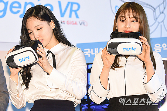 [엑스포츠뉴스=박지영 기자] 9일 오전 서울 종로구 KT스퀘어에서 열린 '지니 VR' 론칭 기념 기자간담회에 참석한 트와이스 나연과 지효가 VR 서비스를 시연하고 있다.