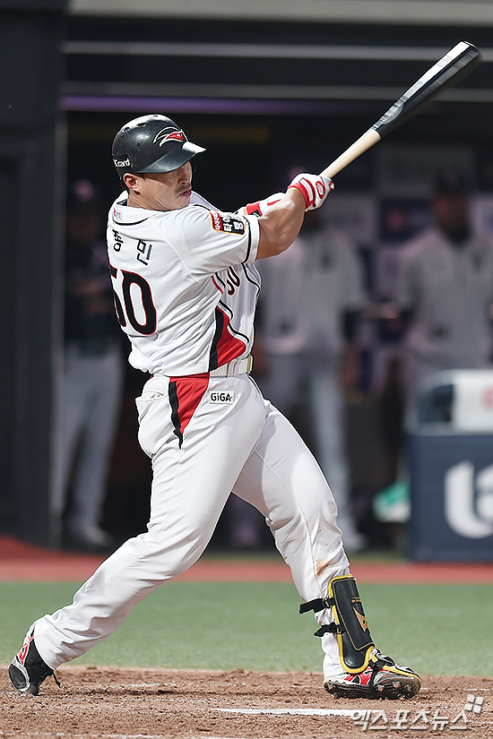 [엑스포츠뉴스=수원, 박지영 기자] 9일 오후 경기도 수원시 장안구 수원kt위즈파크에서 열린 '2016 타이어뱅크 KBO리그' 두산 베어스와 kt 위즈의 경기, 4회말 1사 2루 kt 김종민이 타격하고 있다.