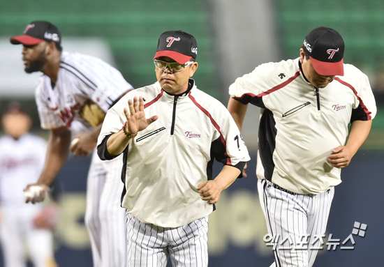 [엑스포츠뉴스=권혁재 기자] 14일 오후 서울 송파구 잠실야구장에서 열린 '2016 타이어뱅크 KBO 리그' NC 다이노스와 LG 트윈스와의 경기, 7회초 1아웃 1루 LG 양상문 감독이 마운드에 올라 선발투수 헨리 소사와 대화를 나눈 뒤 내려가고 있다.