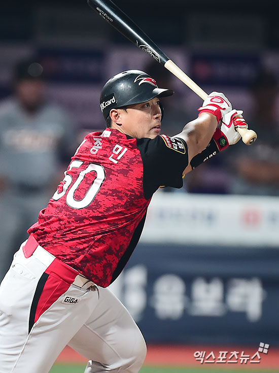 [엑스포츠뉴스=수원, 김한준 기자] 16일 오후 경기도 수원시 장안구 수원kt위즈파크에서 열린 '2016 타이어뱅크 KBO리그' 한화 이글스와 kt 위즈의 경기, 5회말 2사 2루 kt 김종민이 1타점 2루타를 날리고 있다.