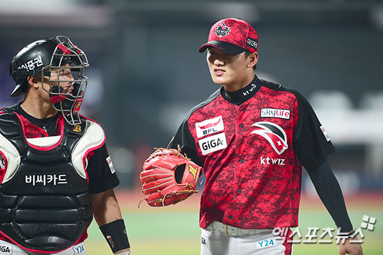 [엑스포츠뉴스=수원, 김한준 기자] 16일 오후 경기도 수원시 장안구 수원kt위즈파크에서 열린 '2016 타이어뱅크 KBO리그' 한화 이글스와 kt 위즈의 경기, 6회초 2사 kt 선발투수 주권이 한화 하주석을 유격수 플라이로 처리한 후 포수 김종민과 대화를 나누며 더그아웃으로 향하고 있다.