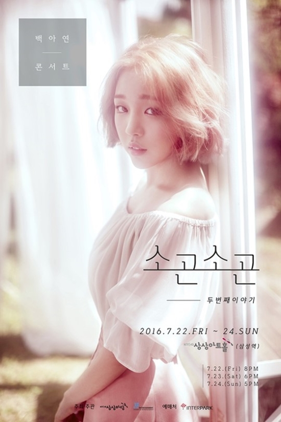 백아연은 오는 22일부터 24일까지 3일 간 총3회에 걸쳐 서울 삼성동 KT&G상상아트홀에서 두 번째 단독 콘서트 '소곤소곤' 두 번째 이야기를 개최한다.