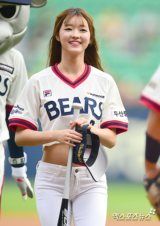 [엑스포츠뉴스 = 김한준 기자] 10일 오후 서울 송파구 잠실야구장에서 열린 '2016 타이어뱅크 KBO리그' KIA 타이거즈와 두산 베어스의 경기, 걸그룹 오마이걸 유아가 시타를 마친 후 미소를 보이고 있다.