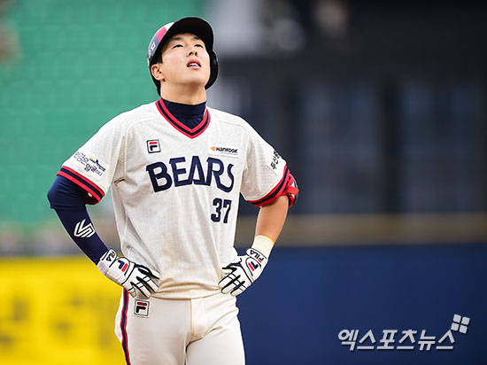 [엑스포츠뉴스 = 김한준 기자] 10일 오후 서울 송파구 잠실야구장에서 열린 '2016 타이어뱅크 KBO리그' KIA 타이거즈와 두산 베어스의 경기, 3회초 1사 1루 두산 박건우가 우익수 플라이로 아웃되자 아쉬워하고 있다.