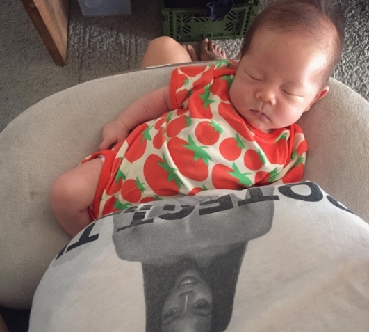 김나영은 20일 자신의 인스타그램을 통해 "나오미 켐벨에게 안긴 우리집 초소형 인간 25days old"라는 글과 함께 사진 한 장을 게재했다.