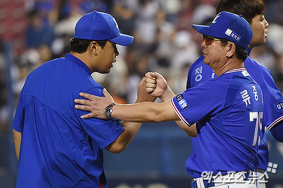이날 경기에서 승리한 삼성 류중일 감독이 선수들과 하이파이브를 나누고 있다.