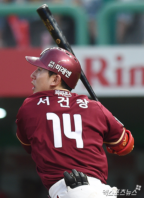 [엑스포츠뉴스=인천, 박지영 기자] 23일 오후 인천SK행복드림구장에서 열린 '2016 타이어뱅크 KBO리그' 넥센 히어로즈와 SK 와이번스의 경기, 2사 만루 넥센 서건창이 2타점 적시타를 치고 있다.