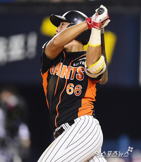 [엑스포츠뉴스 김한준 기자] 26일 오후 서울 송파구 잠실야구장에서 열린 '2016 타이어뱅크 KBO리그' 롯데 자이언츠와 LG 트윈스의 경기, 8회초 롯데 김상호가 솔로 홈런을 날리고 있다.