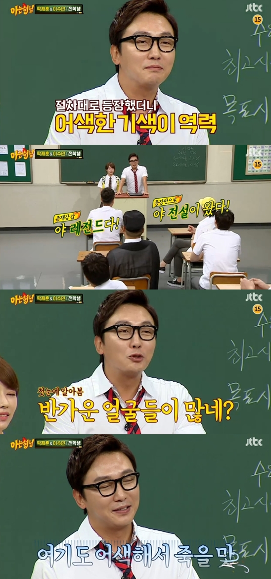 이날 탁재훈은 전학생 최초로 일찍 등교했지만 이내 쫓겨났다. 탁재훈의 등장에 멤버들은 "레전드다"고 반겼다.