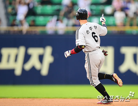 [엑스포츠뉴스 김한준 기자] 2일 오후 서울 송파구 잠실야구장에서 열린 '2016 타이어뱅크 KBO리그' LG 트윈스와 두산 베어스의 경기, 1회초 1사 LG 손주인이 솔로 홈런을 날린 후 그라운드를 돌고 있다.