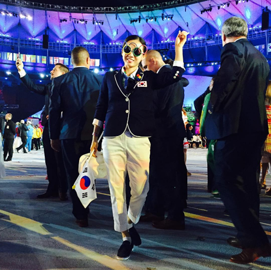 공개된 사진 속 남현희는 6일 진행된 리우올림픽 개막식에서 오륜기 선글라스를 착용하고 활짝 웃고 있다. 2004 아테네 올림픽을 통해 처음 올림픽 무대를 밟은 남현희는 2008 베이징 올림픽에서 한국 여자 펜싱 최초로 은메달을 수확했고 2012 런던 올림픽에서는 동메달을 따냈다.